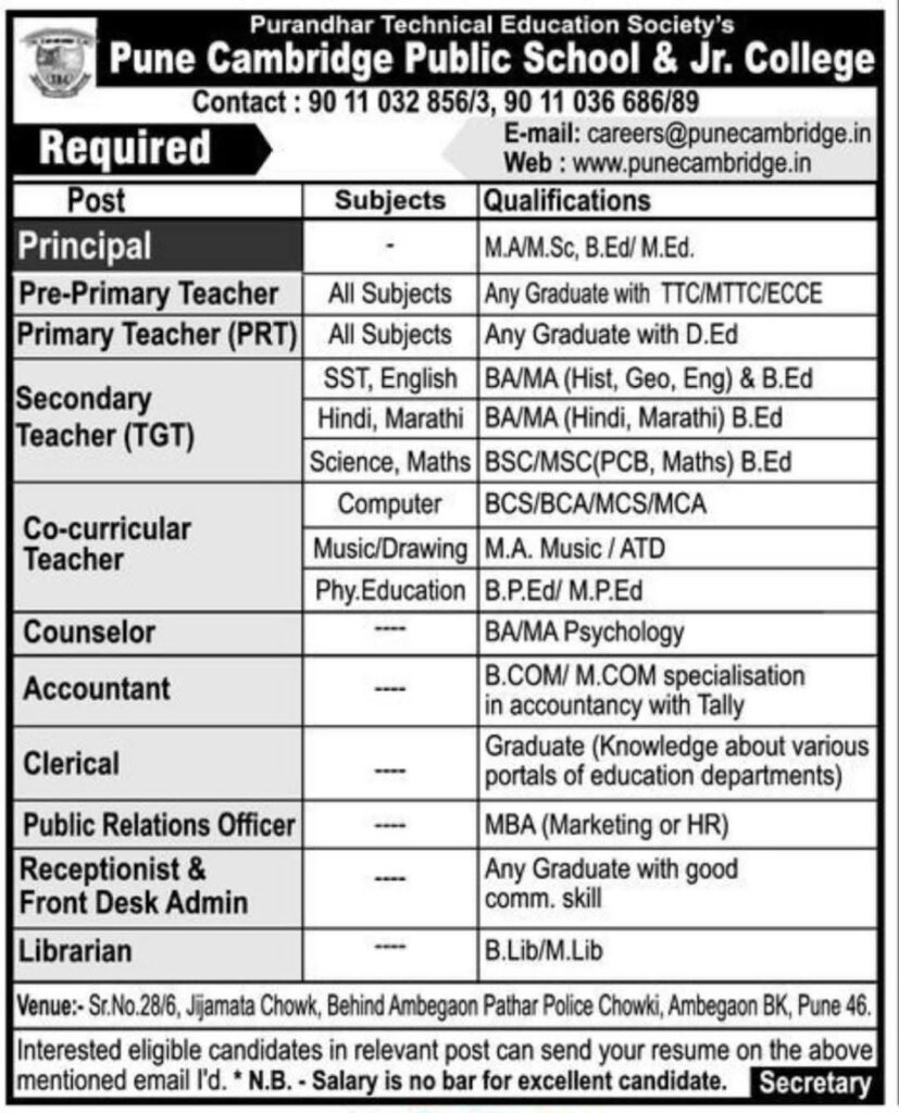 Pune Cambridge Public School & Jr. College has required Teachers on Various Subject ( Marathi, Maths, Computer, Science, Music, Phy. Education, Marketing)